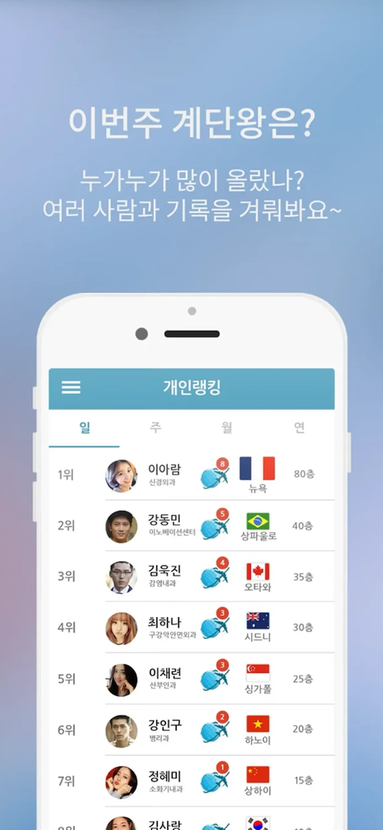 소모 칼로리, 이동 층수, 개인/팀 랭킹을 한눈에 확인. 시각화된 데이터로 성취감을 높입니다.